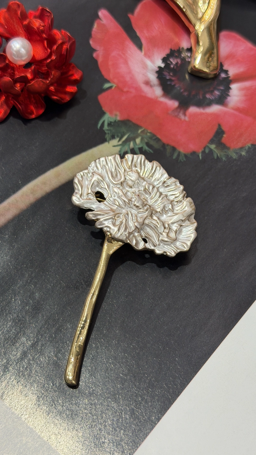Kırmızı İnci Detay Çiçek Broş