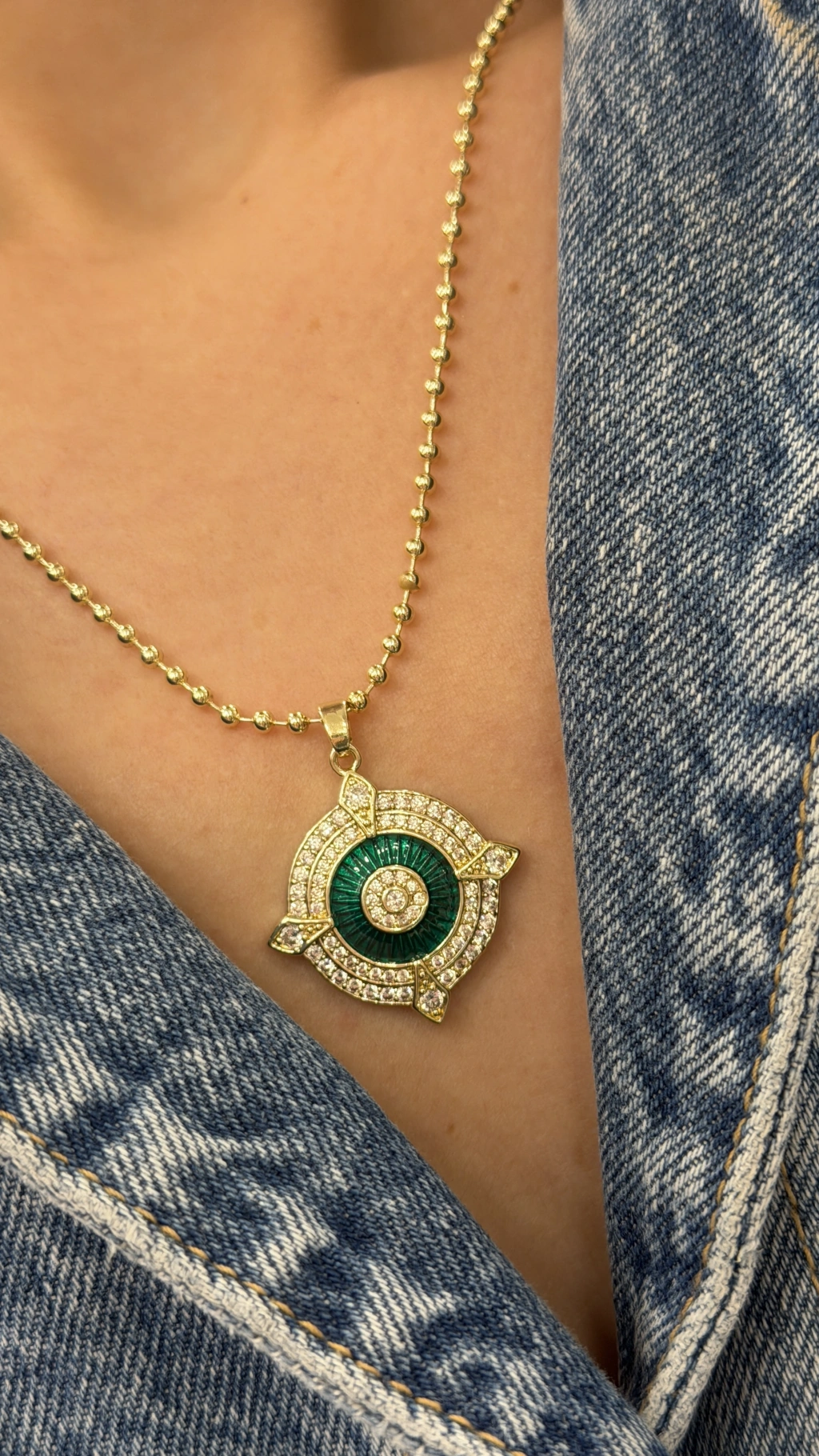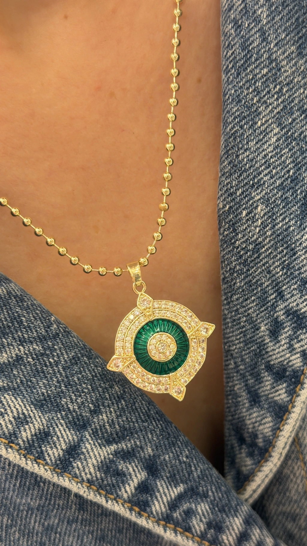 YUVARLAK FİGÜR YEŞİL CAM MİNELİ TOP ZİNCİR KOLYE GOLD (40 CM)