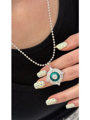 Yuvarlak Figür Yeşil Cam Mineli Top Zincir Kolye Gümüş (40 cm)